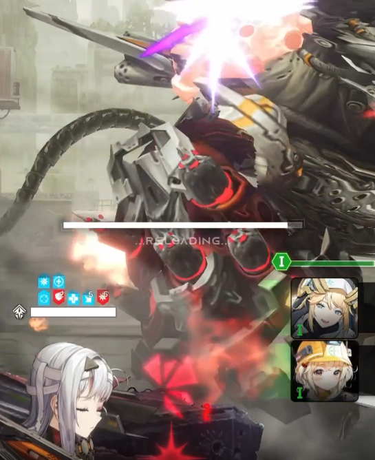 - 스탬핑 : 한 손으로 지면을 강하게 내려쳐 단일 니케에게 큰 피해 + 방어력 감소